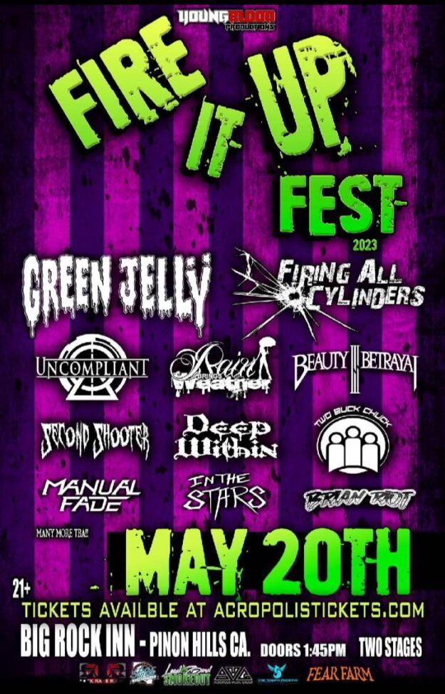 All day event, bands start at 2pm. May 20th Bands include: Green Jelly Firing All Cylinders Beauty Betrayal Rain Brings Weather Deep Within Uncompliant T$C And more!